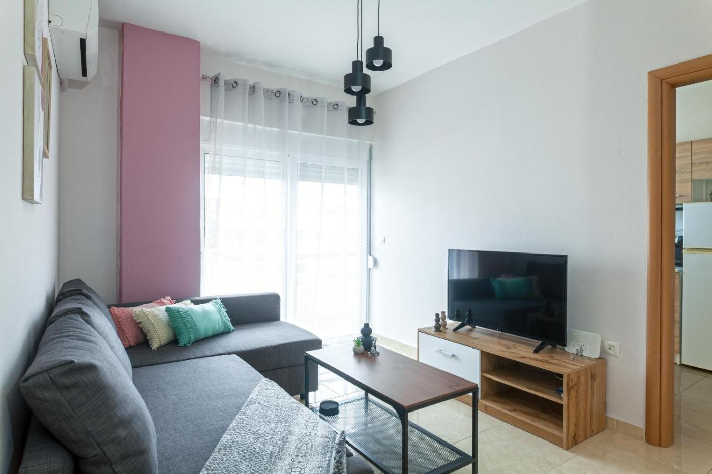 One-Bedroom Apartment. This air-conditioned apartment includes 1 living room, 1 separate bedroom and 1 bathroom with a shower. In the well-equipped kitchen, guests will find a stovetop, a refrigerator, kitchenware and an oven. There is a washing machine, a tea and coffee maker and a terrace and complimentary winechampagne is offered for guests. The unit has 2 beds.
